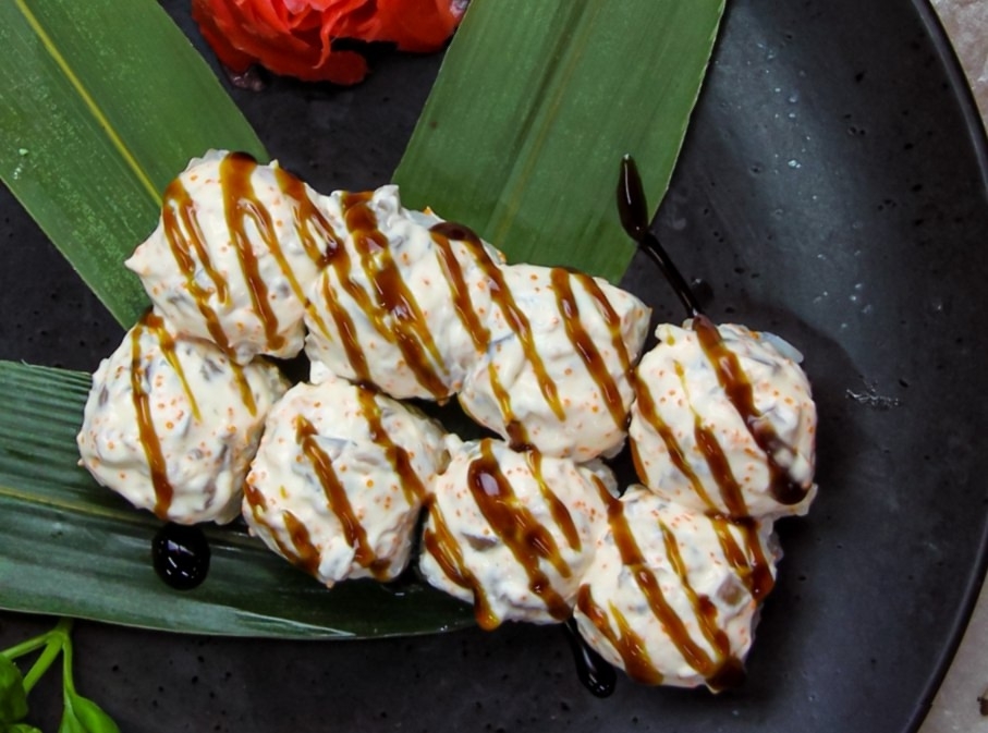 СНЕЖНЫЙ КРАБ, ЛОСОСЬ, ТВОРОЖНЫЙ СЫР, ОГУРЕЦ, ИКРА ТОБИКО, СОУС УНАГИ (290 г.)