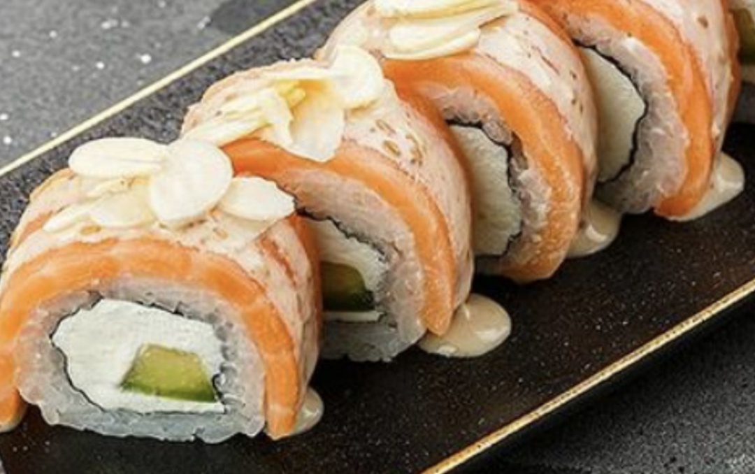 Рис, нори, лосось, огурец, сливочный сыр, ореховый соус, лепестки миндаля (280 г.)