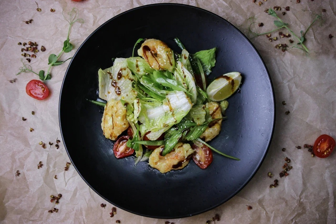 Микс салата, огурец, черри, руккола, фирменная заправка, соус чили биян, креветки васаби (250 г.)