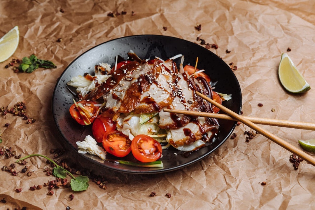 Микс-салата, утка, лук-порей, огурец, соус-заправка, черри, соус хойсин (250 г.)