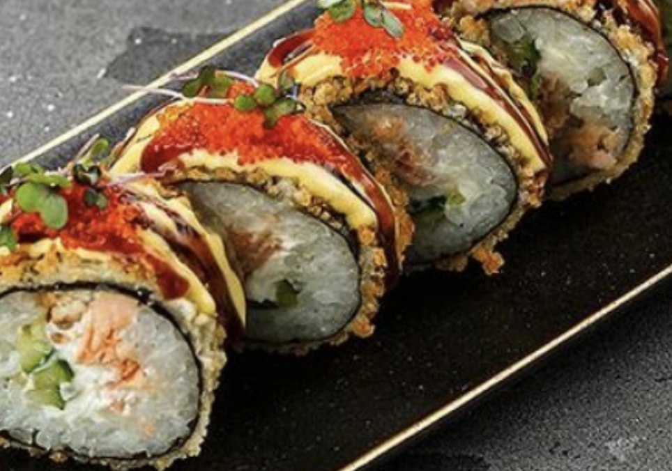 Рис, нори, лосось, огурец, сливочный сыр, икра тобико, соус манго, соус унаги, кунжут (290 г.)