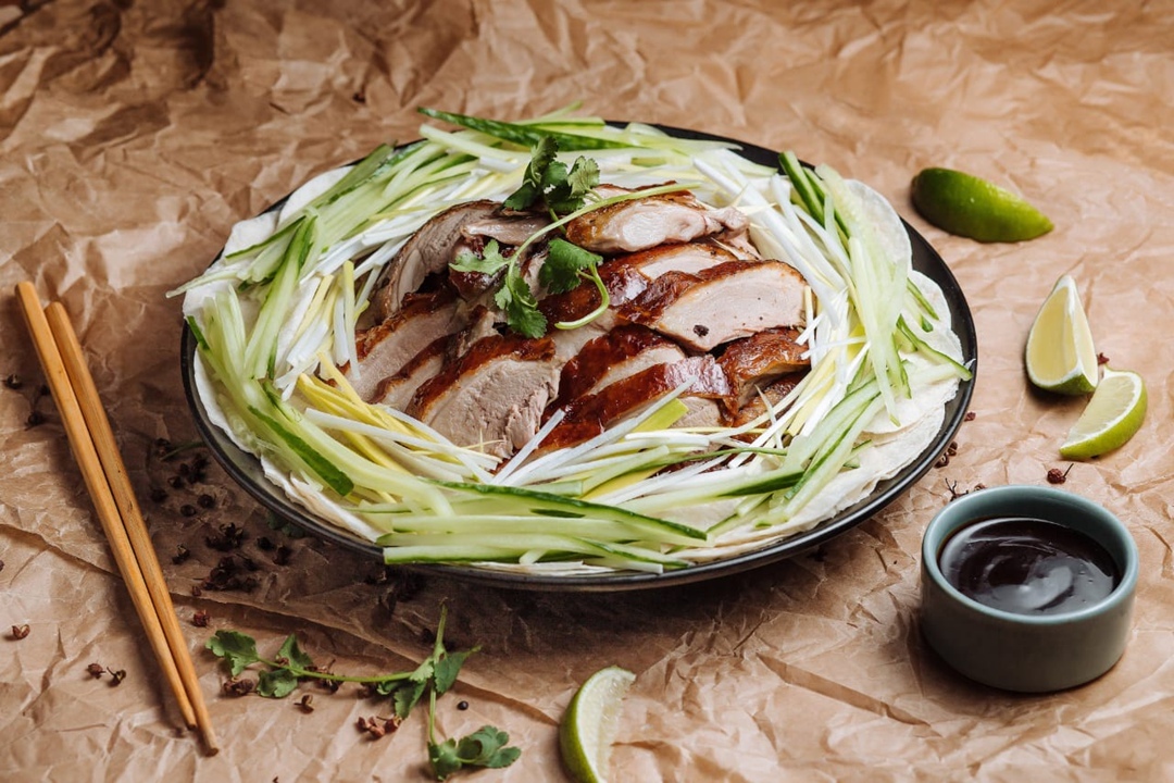 Подается с бульоном ФО-БО, блинчики, соус хойсин, лук-порей, огурец (850 г.)